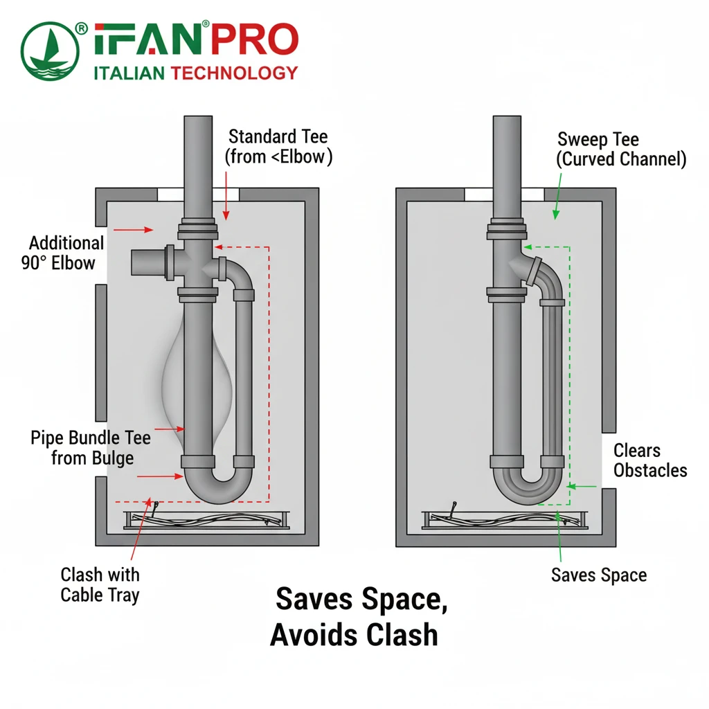 The primary space advantage of sweep tees is their ability to create a branch connection with a wider, more gradual bend. This often allows for installation in tighter vertical or horizontal spaces where the longer radius of the curve can be accommodated more easily than the rigid geometry of a standard tee, which requires more clearance for straight pipe entry.