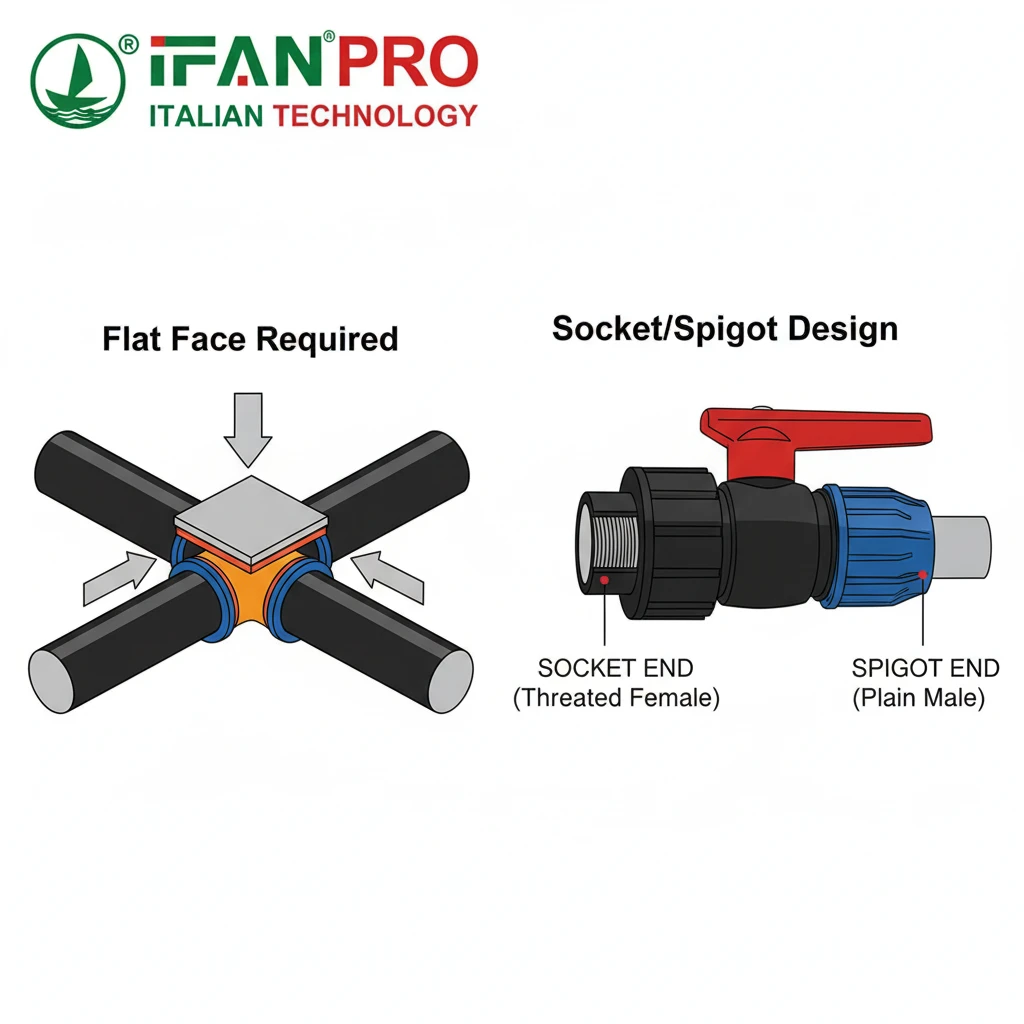 First, you need to understand the shapes involved. The butt fusion process is designed for joining two flat, smooth ends. However, a standard HDPE female valve has a different shape. One end has internal threads (the “female” part), and the other end is usually a plain spigot (a male end) designed for socket fusion. Therefore, neither of these ends is flat.