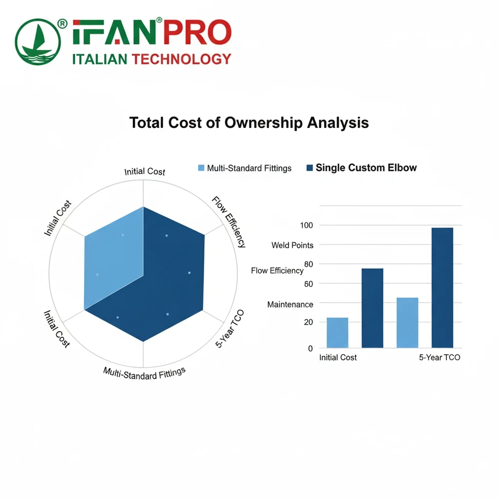 The table shows that while the custom elbow costs $1,000 more on day one, it saves money within the project’s life. The savings come from lower energy use, almost zero maintenance, and no downtime from failures. The custom part pays for itself.