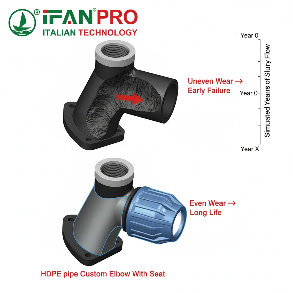 Custom HDPE elbows extend service life by allowing for optimized design with uniform wall thickness and smooth flow paths. This prevents localized wear “hot spots,” ensuring the entire fitting wears evenly. This can double or triple the time between replacements, directly cutting material and installation costs.
