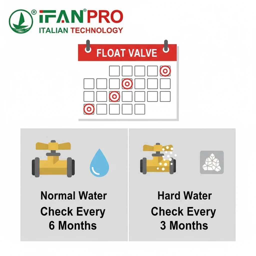 For most systems, inspect and clean your float valve at least every 6 to 12 months. However, if you have hard water with high mineral content, inspect it every 3 to 4 months. Also, check it immediately if you notice slow filling, constant running water, or visible leaks.