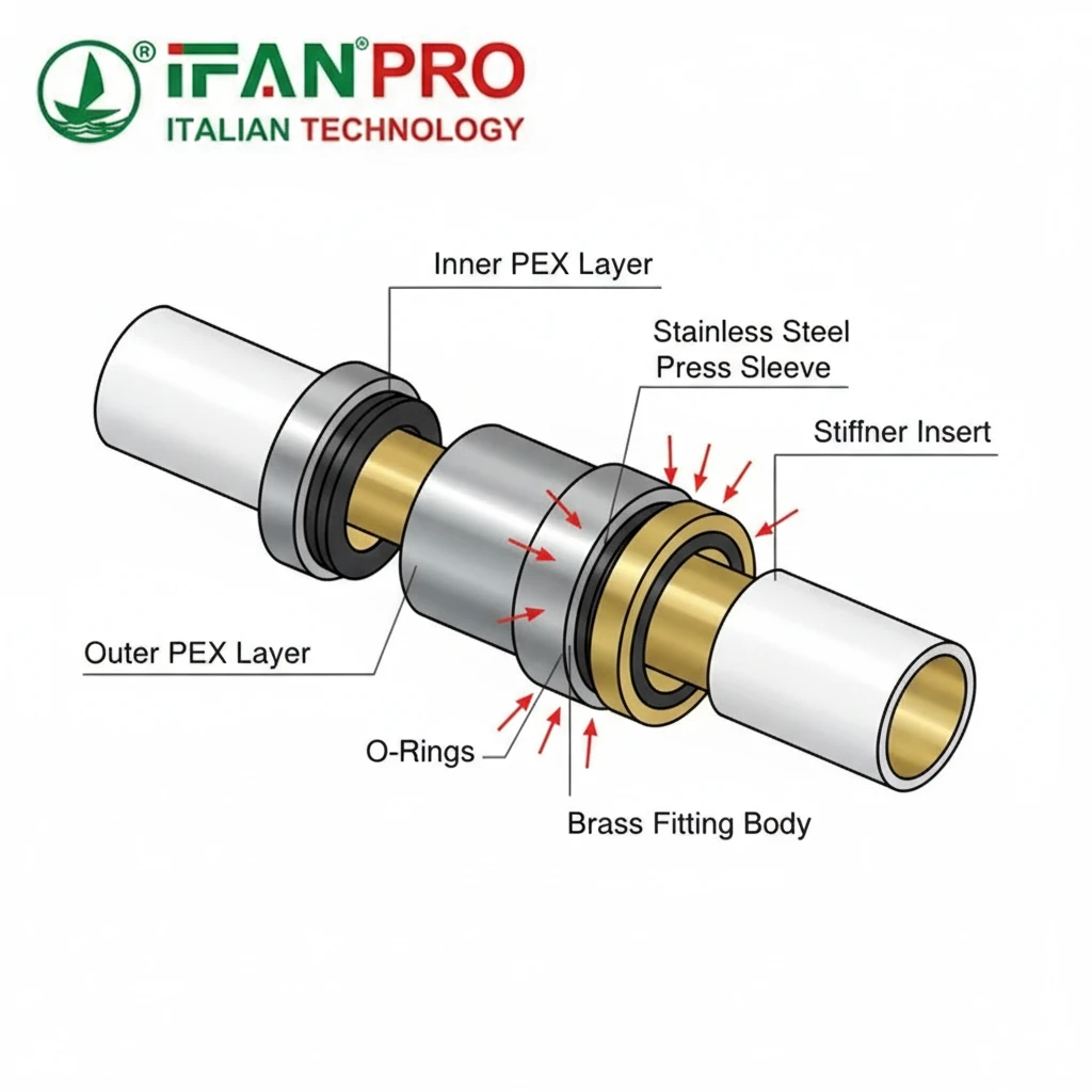 - Precision Compression: When you press the external sleeve, it does not squeeze the sealing ring directly. Instead, it squeezes the pipe from the outside. This force pushes the exposed PEX section firmly inward against the stationary O-ring. The aluminum layer, now supported by the stiffener, simply transfers this force without being part of the seal.