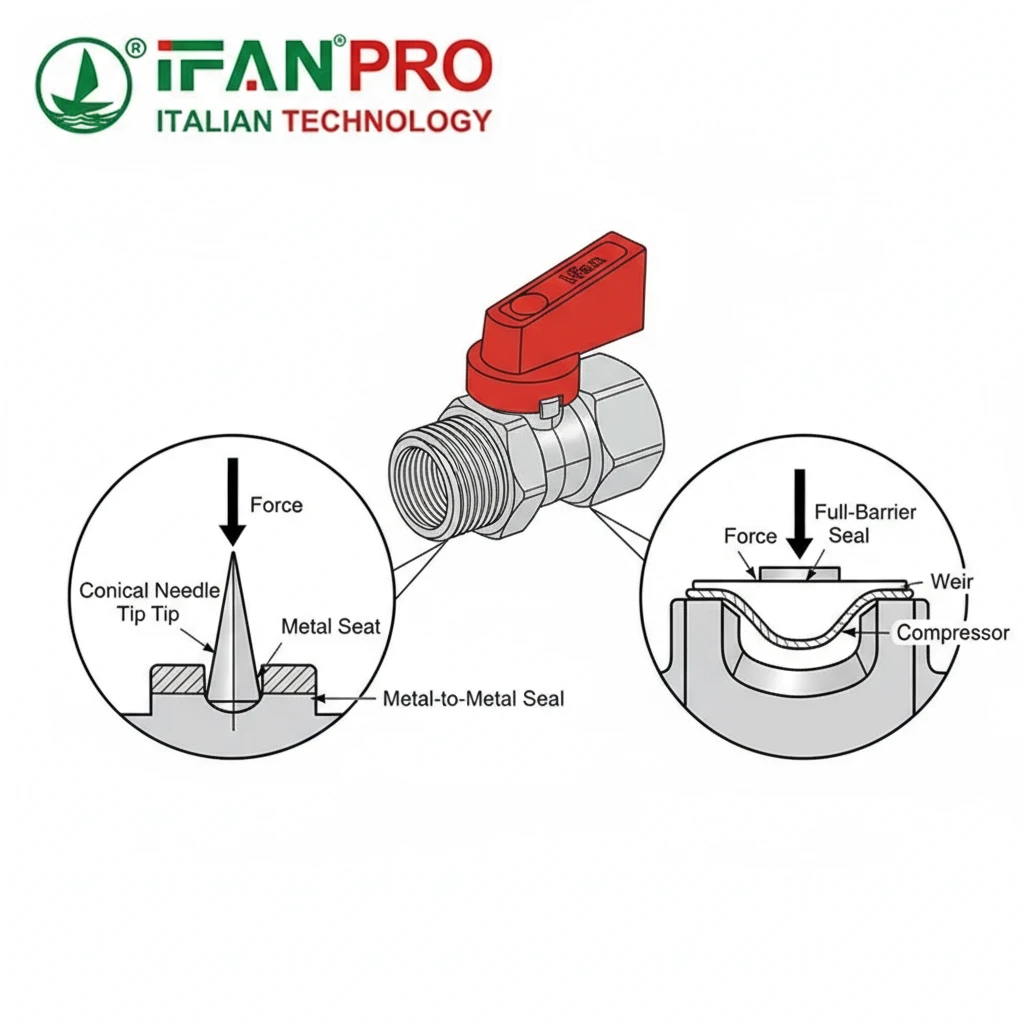 • How it works: When you turn the handle, the needle tip screws down and makes precise metal-to-metal contact with the seat. The tapered shape allows for very gradual and fine control over the flow before shut-off.