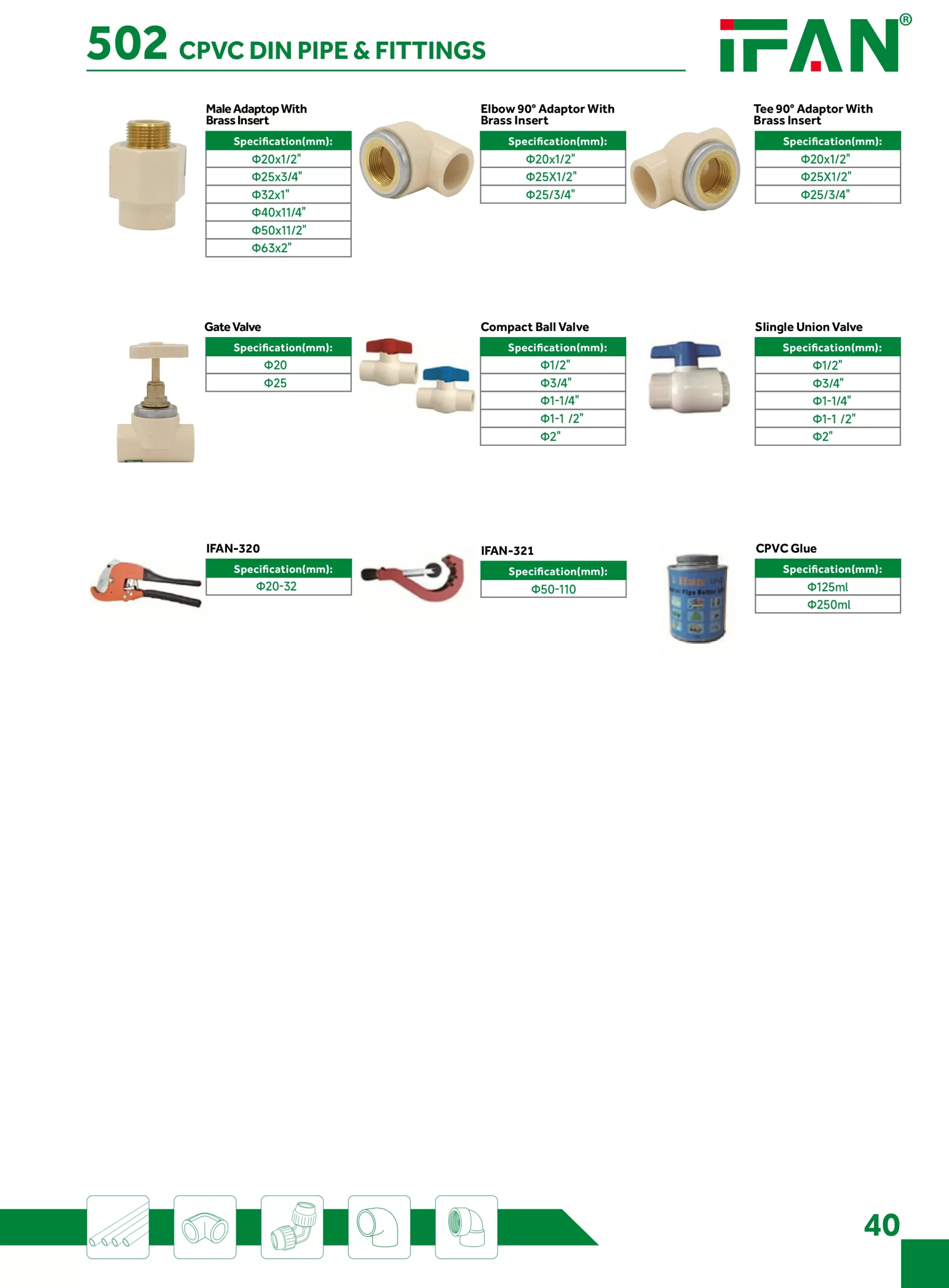 - 20×1/2″, 25×3/4″, 32×1″, 40×1 – 1/4″