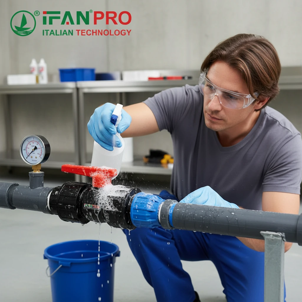 - Soap Test: Next, spray a soapy water solution on every part of the connection: the fusion joint, all flange edges, the valve stem, and the threaded areas. Look for bubbles forming, which indicate an air leak.