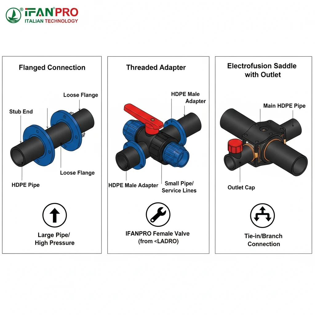 The three most reliable methods are: 1) using a stub end and a back-up flange, 2) using a threaded HDPE male adapter fused to the pipe, or 3) using an electrofusion saddle with a threaded outlet. Each method securely transitions from the HDPE pipe to the female valve’s threads, providing a pressure-rated seal.