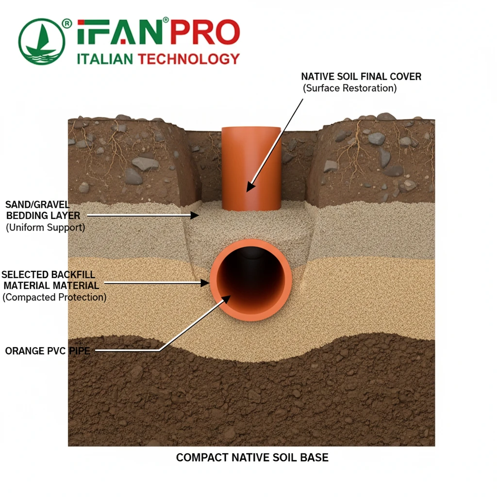 - Final Backfill: Once the pipe is covered by at least 12 inches (300mm) of compacted backfill, you can use standard native soil to finish filling the trench, compacting as you go.
