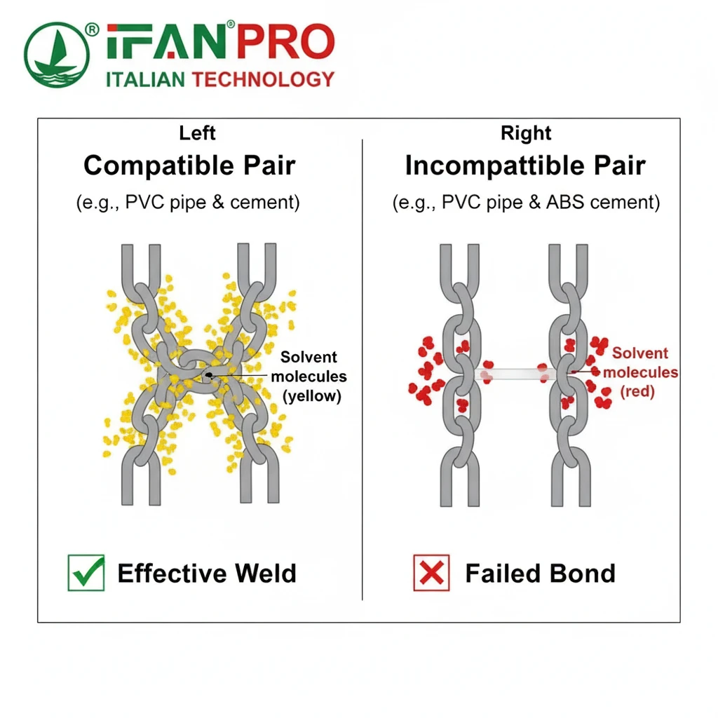 Chemical compatibility matters because the cement must soften the pipe’s surface to create a weld. If the chemicals are not compatible, they will not melt the plastic correctly. This results in a weak bond that can crack or leak immediately or fail months later under stress.