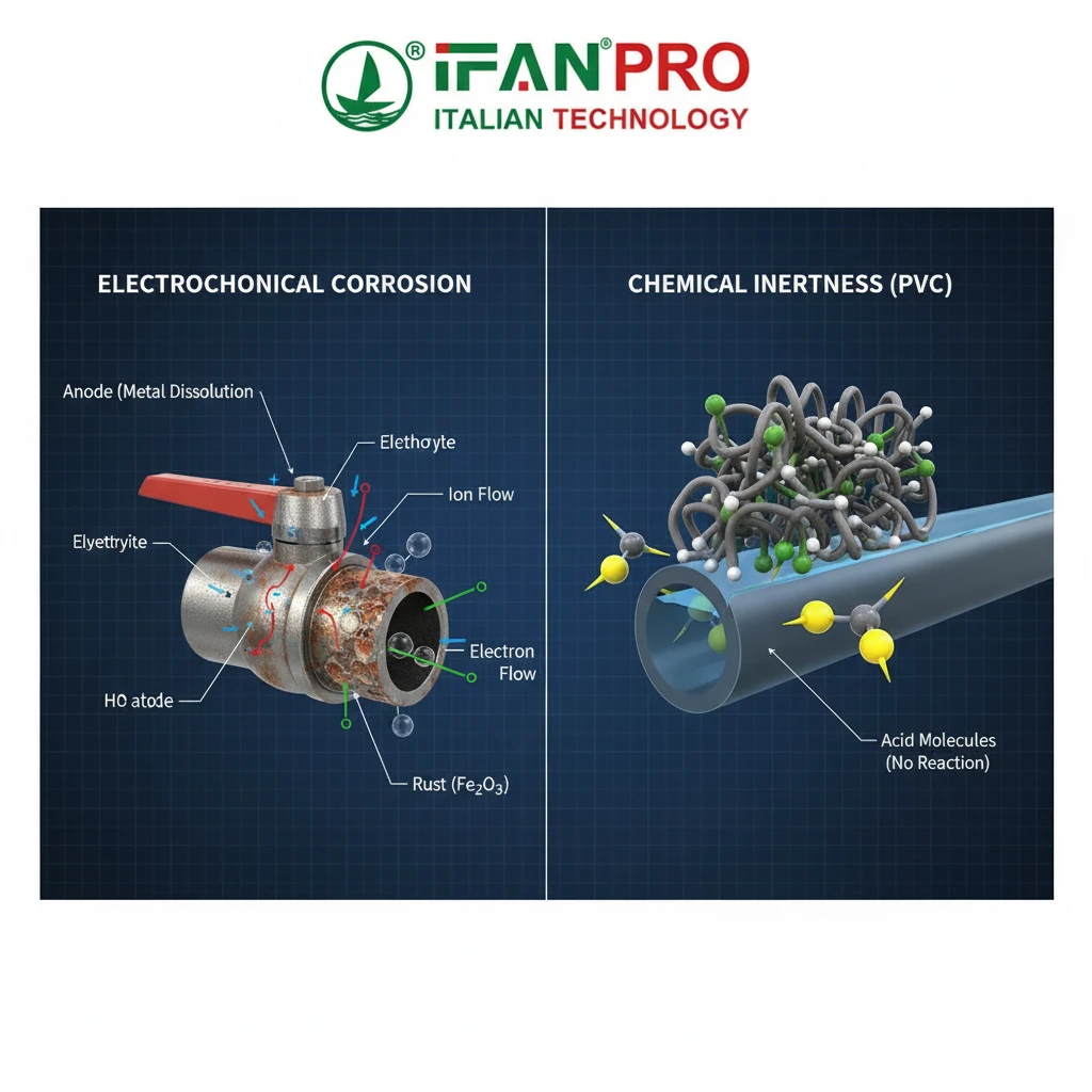 At its core, corrosion in metals is an electrochemical process. Ions flow, and the metal slowly dissolves. PVC valves avoid this problem entirely because they are plastics, not metals. They do not conduct electricity, so this type of corrosion cannot start.