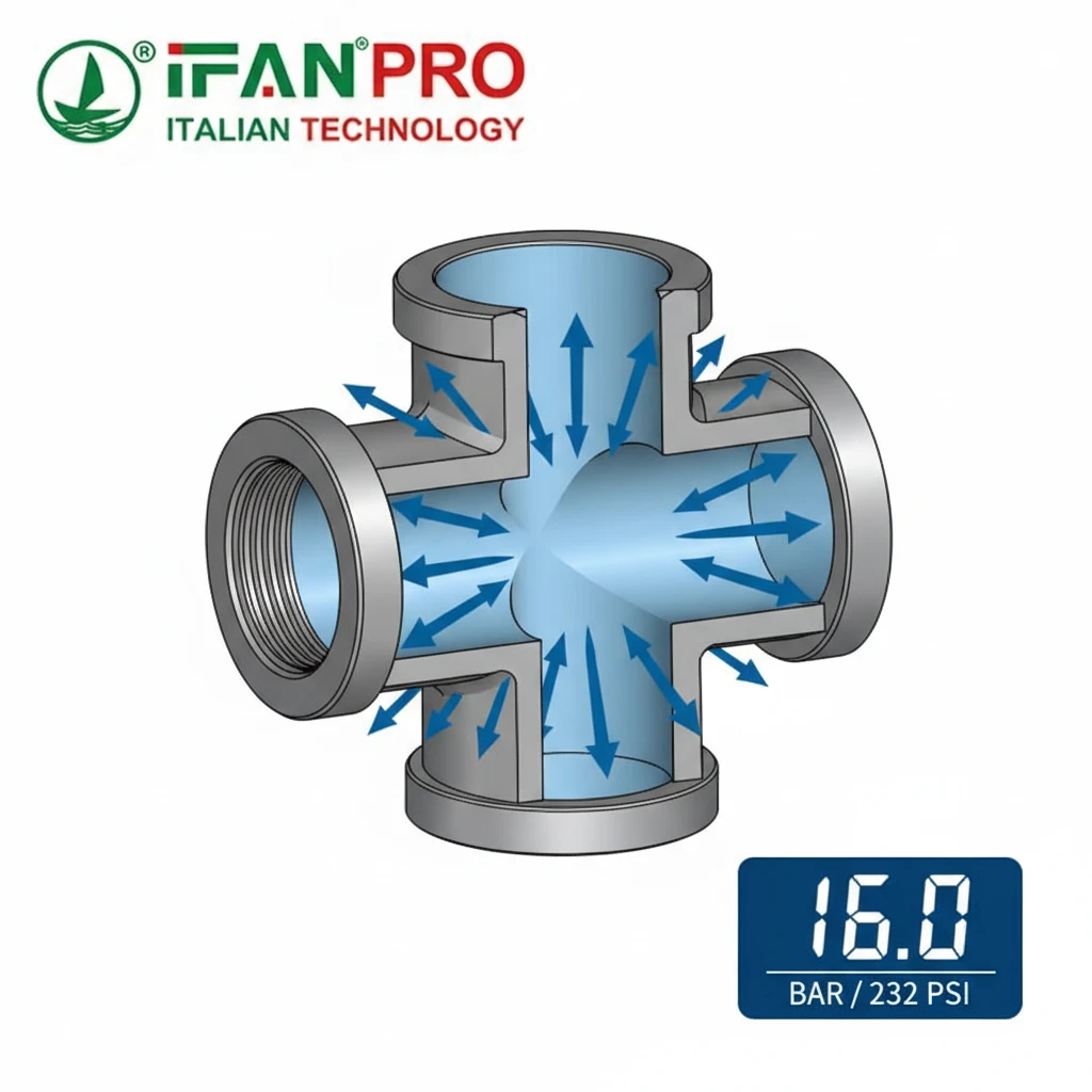 Quality 407 cross tees from IFAN include reinforced hub designs that withstand pressure spikes. The material thickness at branch junctions exceeds minimum requirements, thus providing safety margins for unexpected conditions.