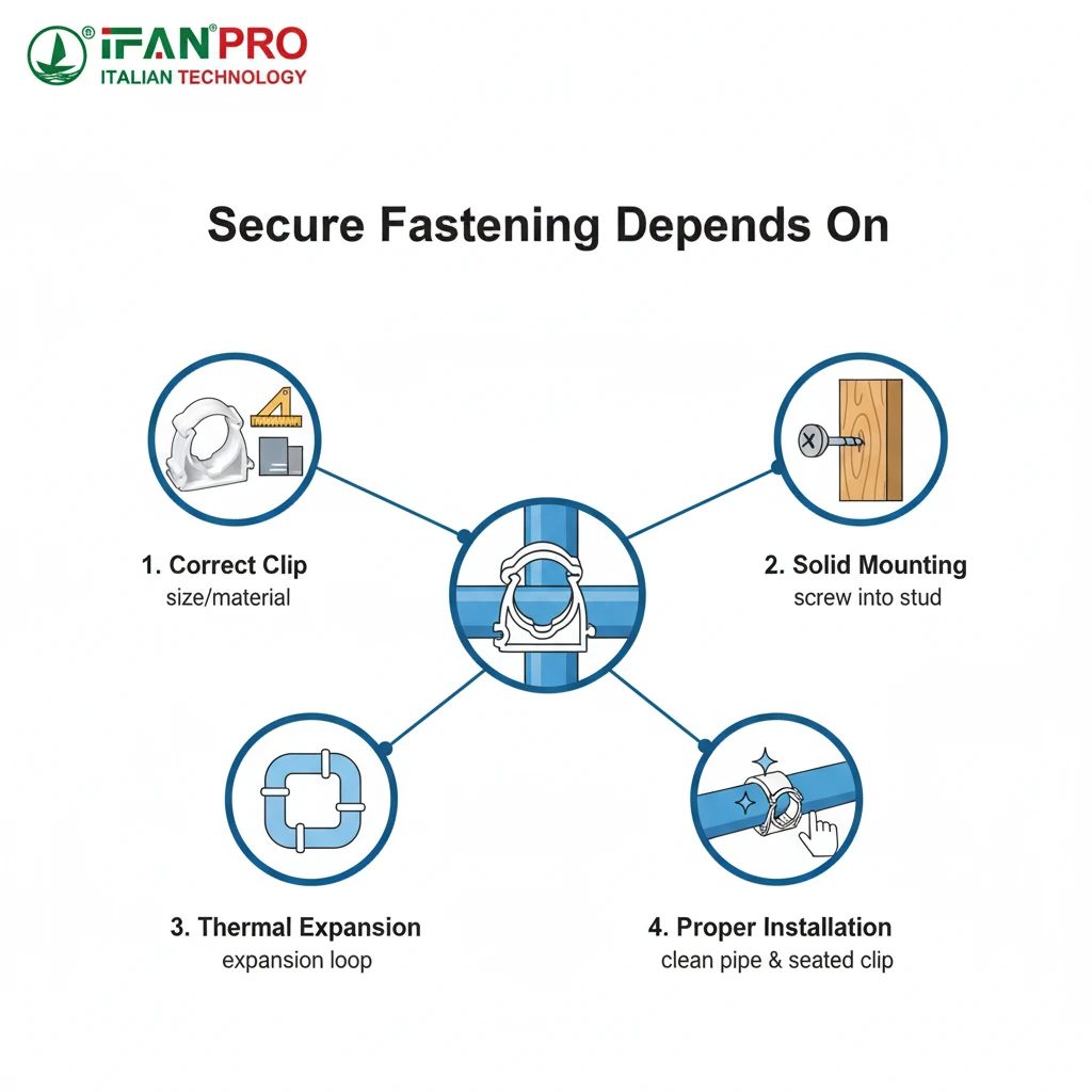 Beyond spacing, secure fastening depends on using the correct clip type (material, size), attaching it to a solid substrate, allowing for thermal expansion, and ensuring the pipe is clean and seated properly in the clip. Ignoring any of these can lead to a failure even with perfect spacing.