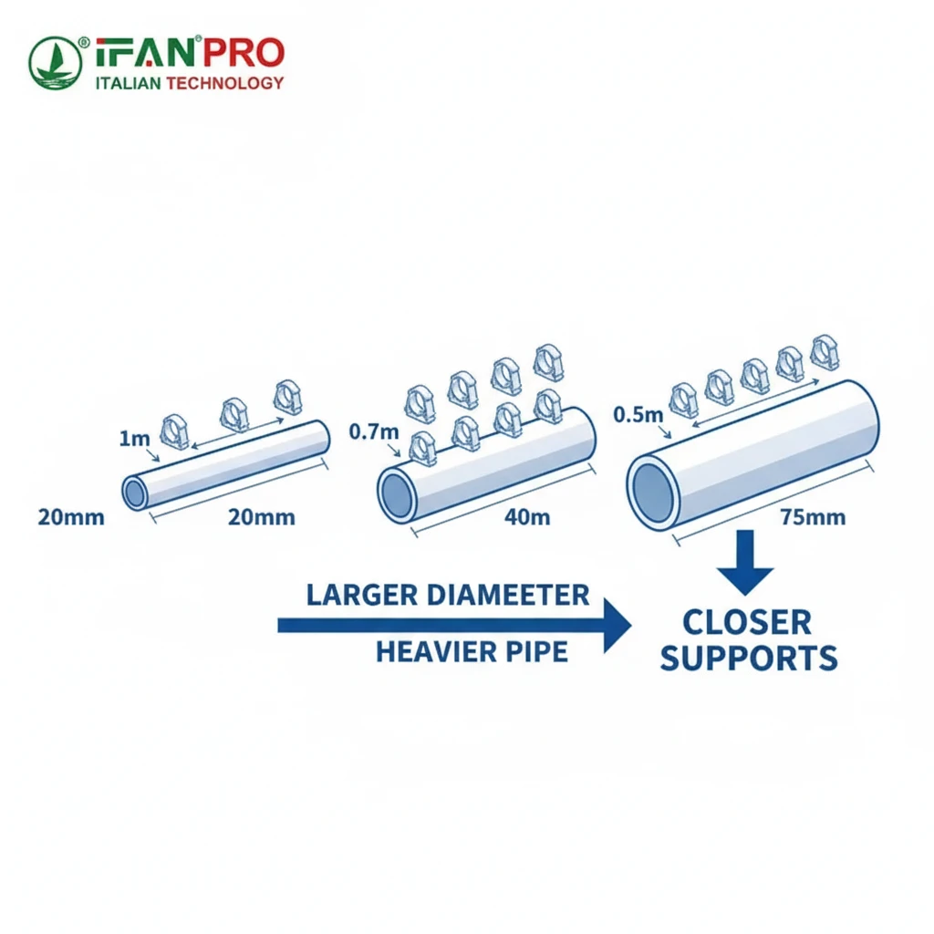 Pipe diameter directly determines clip spacing because larger, heavier pipes are more prone to sagging and movement. Therefore, they require support clips to be placed closer together to prevent bending, reduce stress, and silence water hammer noise. The spacing rule is simple: as the diameter increases, the space between clips decreases.