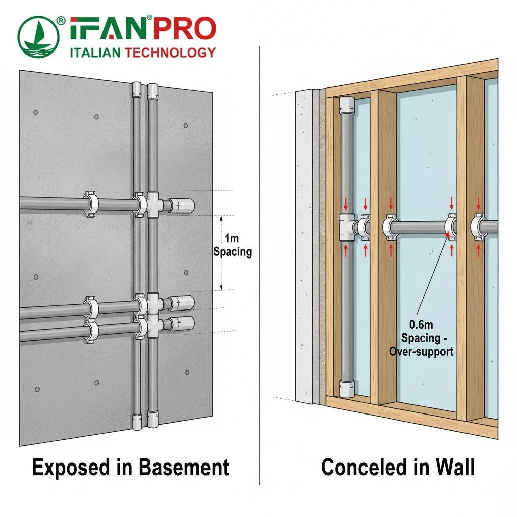 • For Concealed Runs: Take the standard spacing for the pipe diameter and reduce it by about 25%. For instance, if the chart says 0.8m, aim for 0.6m. Always secure the pipe firmly to a solid structural member (stud, joist), never just to drywall or plaster.