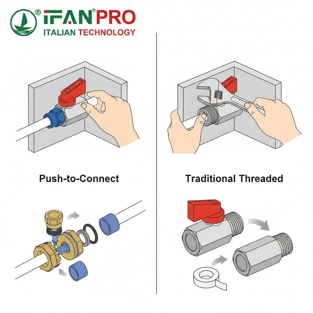 | Push-to-Connect | Push the tubing straight into the valve port. An internal gripper and O-ring seal it instantly. | Fast, tool-free installations; frequent maintenance points. | Very Low – just straight-line access. |