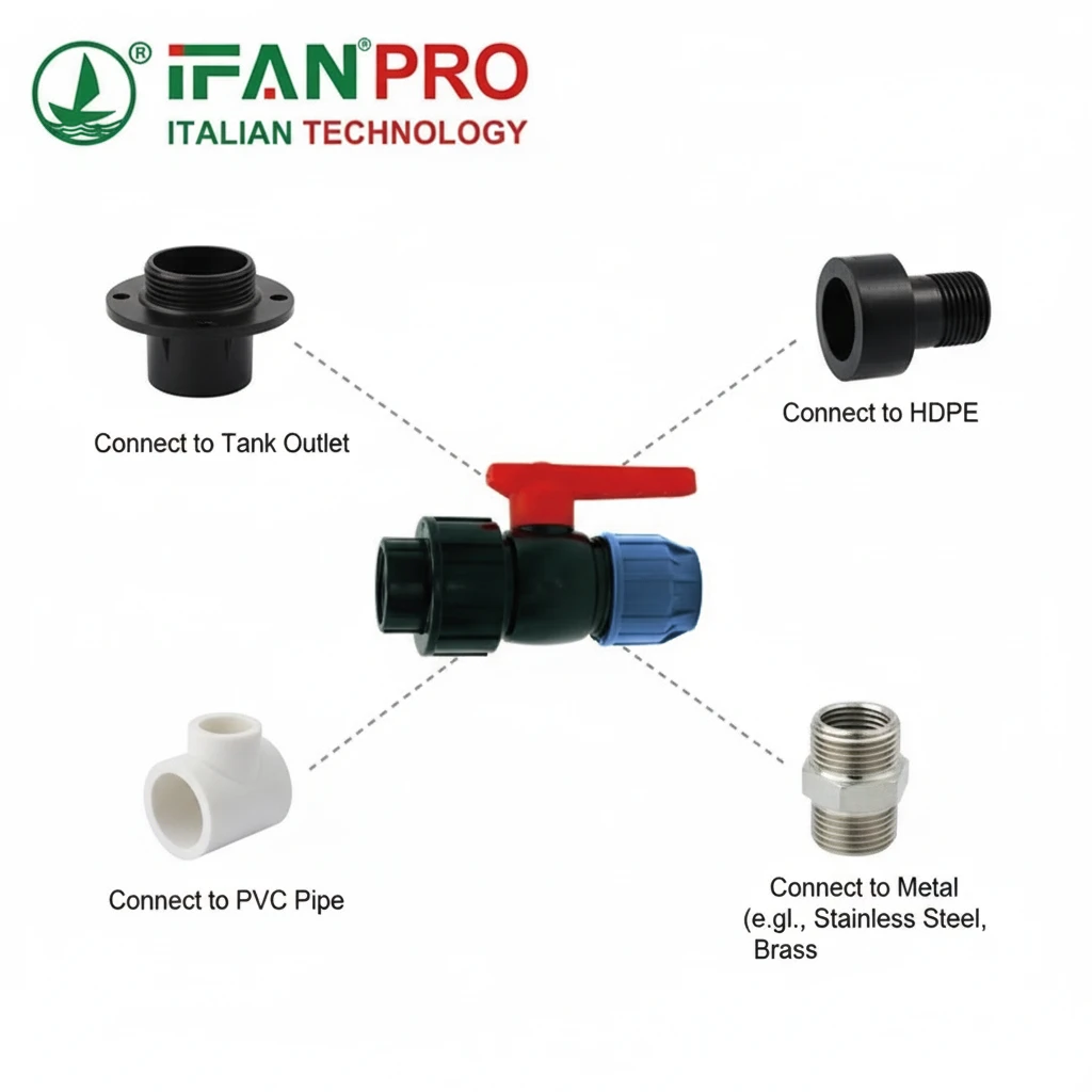 The female threaded valve is the perfect bridge. On the HDPE side, you use a male-threaded HDPE adapter. On the other material side, you use a compatible male-threaded adapter (e.g., stainless steel, PVC). The female valve simply screws onto both, creating a secure transition point. This makes system design much more flexible, as you are not locked into using only one material.