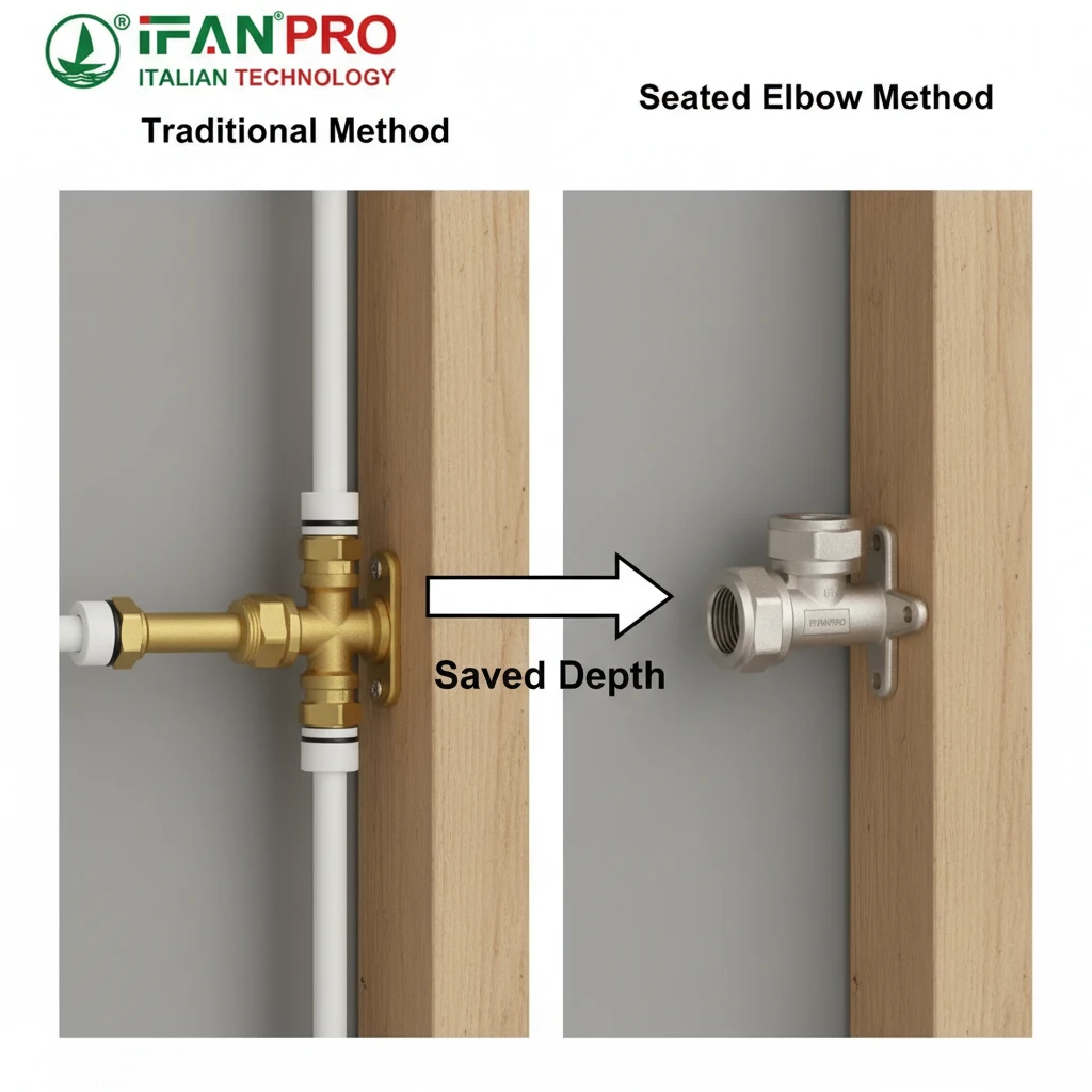 A seated elbow changes this dynamic completely. Its integrated seat mounts flush to the stud face. The water outlet is positioned right at this mounting plane. The PEX pipe comes straight into the side of the elbow, and the fixture threads directly onto its face. The entire assembly exists in a single, thin layer. This can reduce the required depth by 50% or more compared to a stacked, multi-part assembly.
