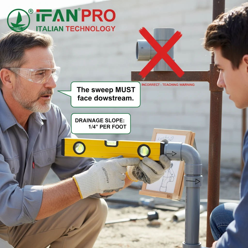 Drainage works on gravity. The pipe must slope downward consistently (usually 1/4 inch per foot for most drains). A sweep tee should not disrupt this slope.